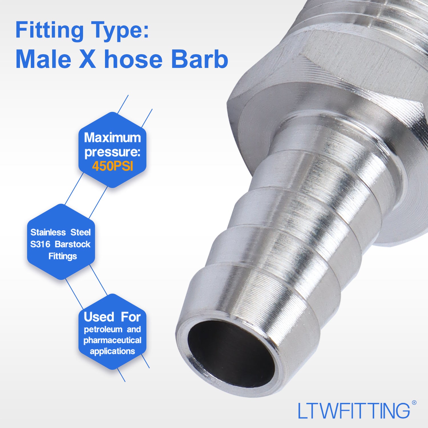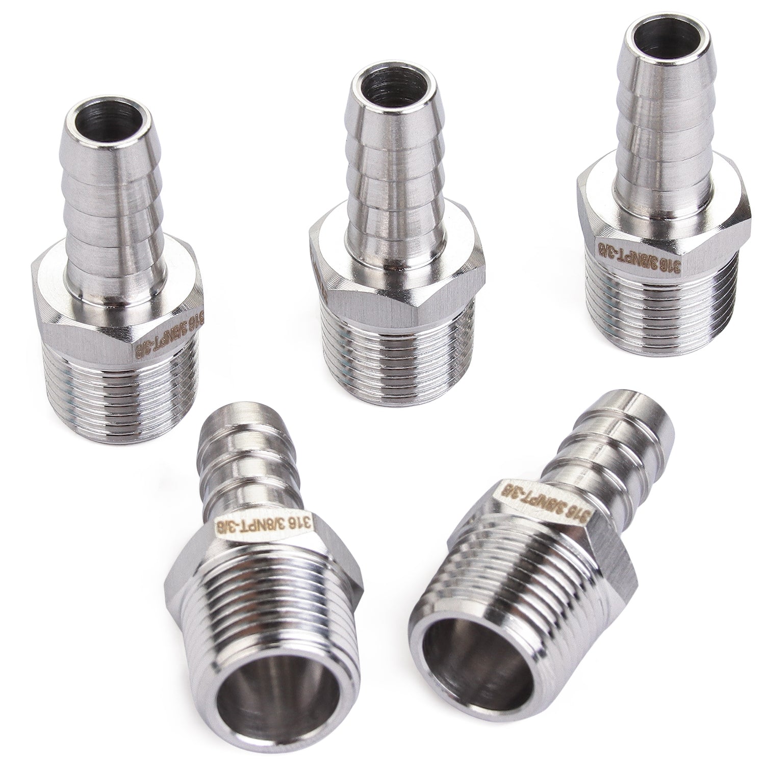 LTWFITTING Bar Production Stainless Steel 316 Barb Fitting Coupler/Connector 3/8 Inch Hose ID x 3/8 Inch Male NPT Air Fuel Water (Pack of 5)