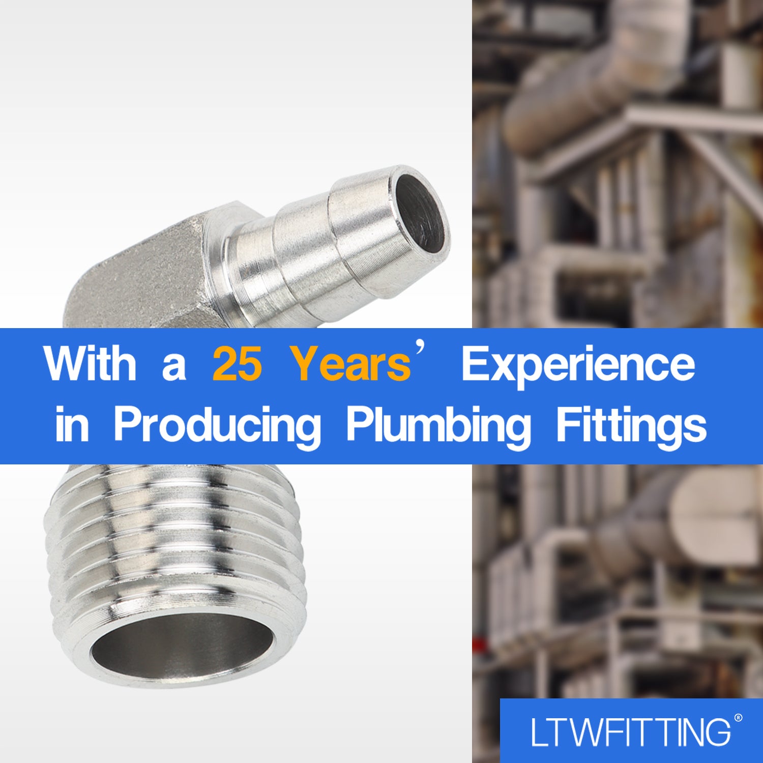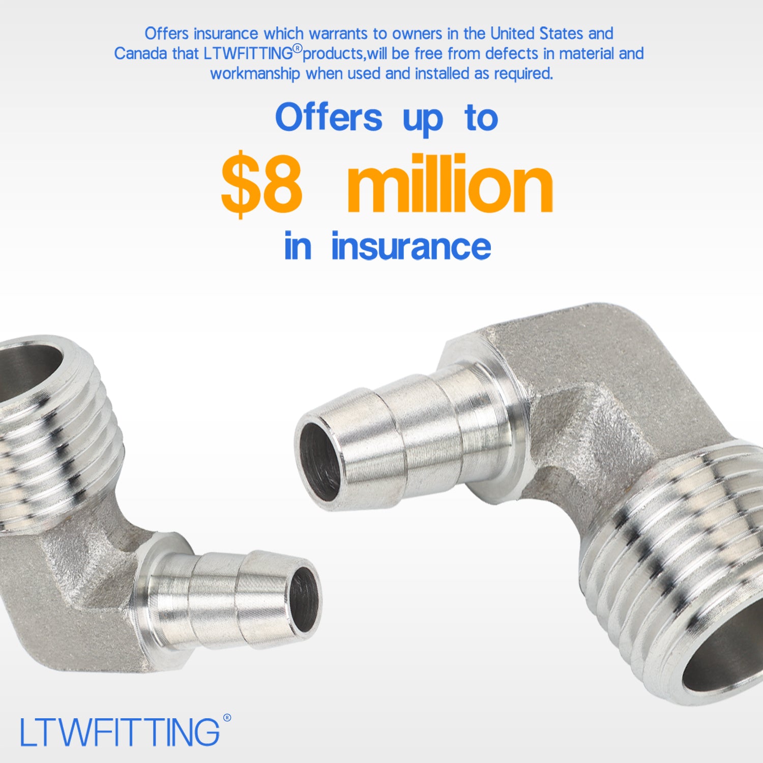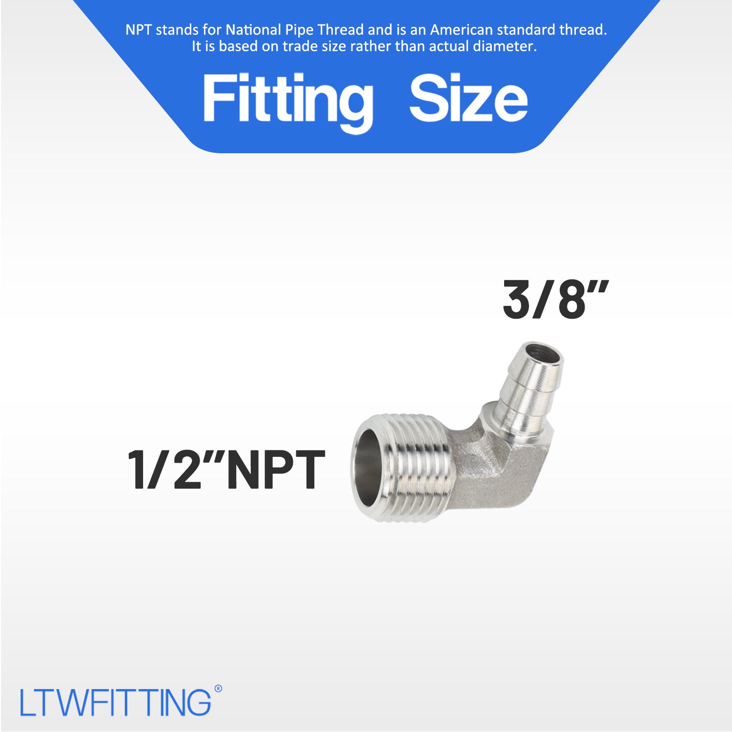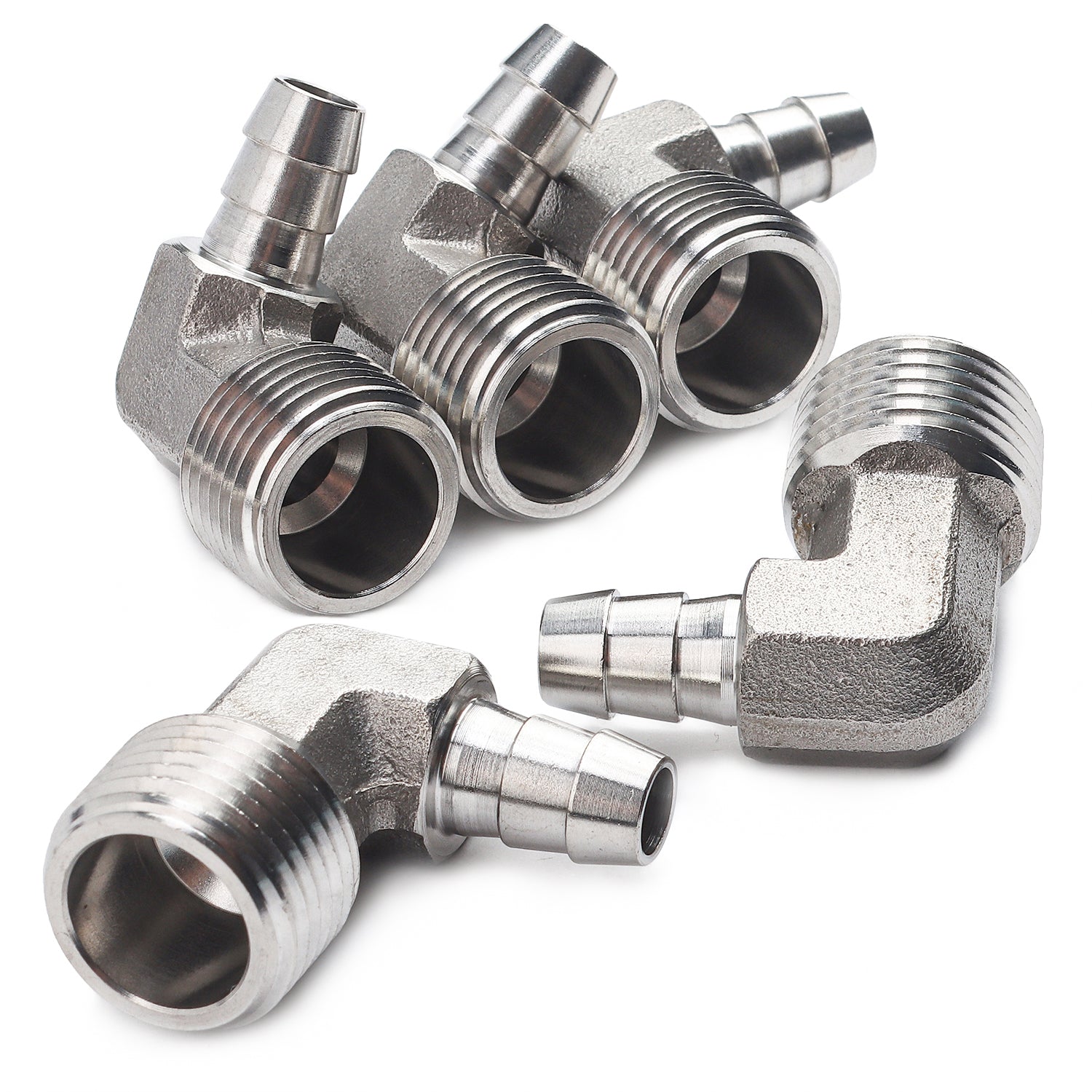 Package Include: 5pcs. Material: Stainless Steel 320. Net Weight: 46g/pc. Type: Male Hose Barb Elbow. Hose ID: 3/8Inch, Thread: 1/2Inch Male NPT.