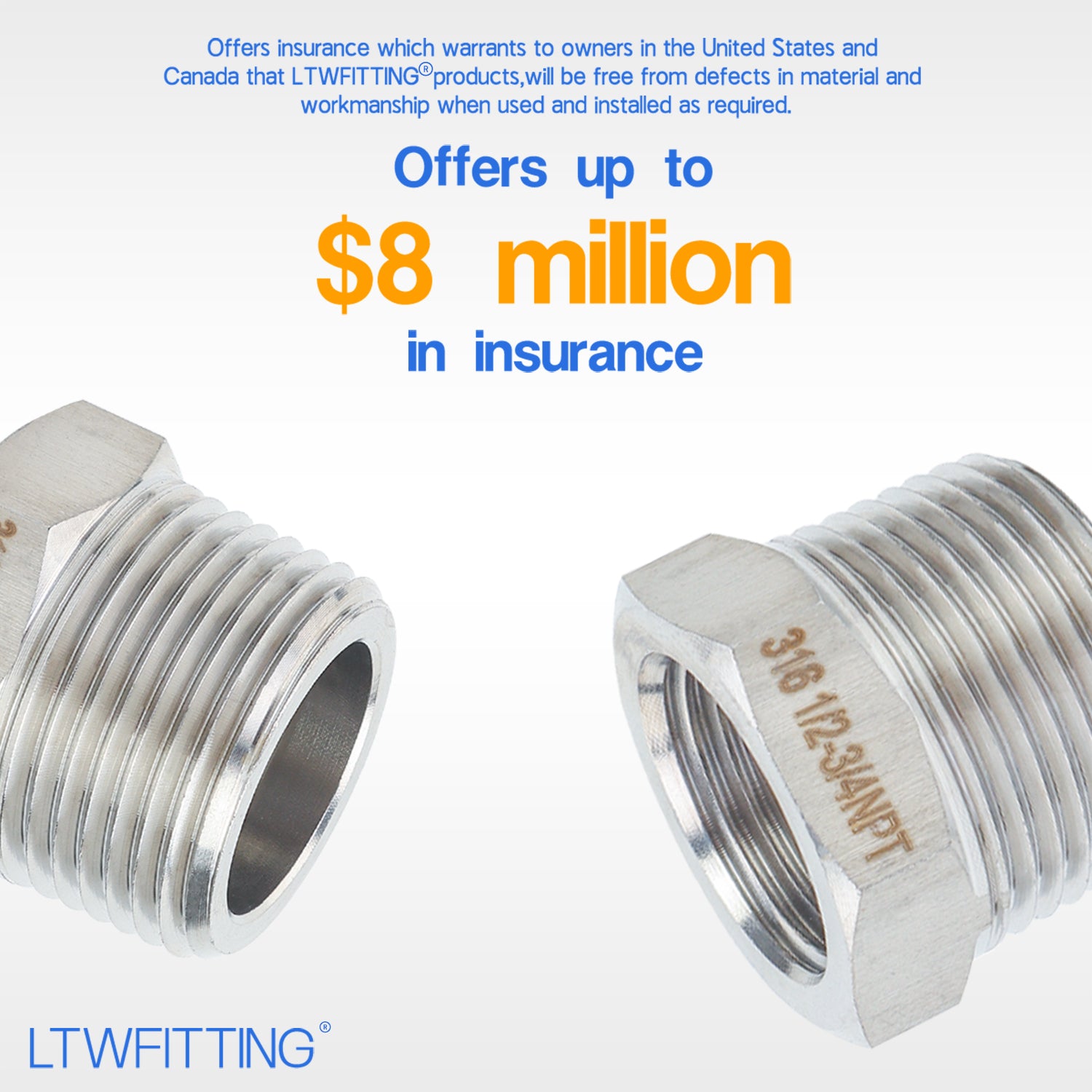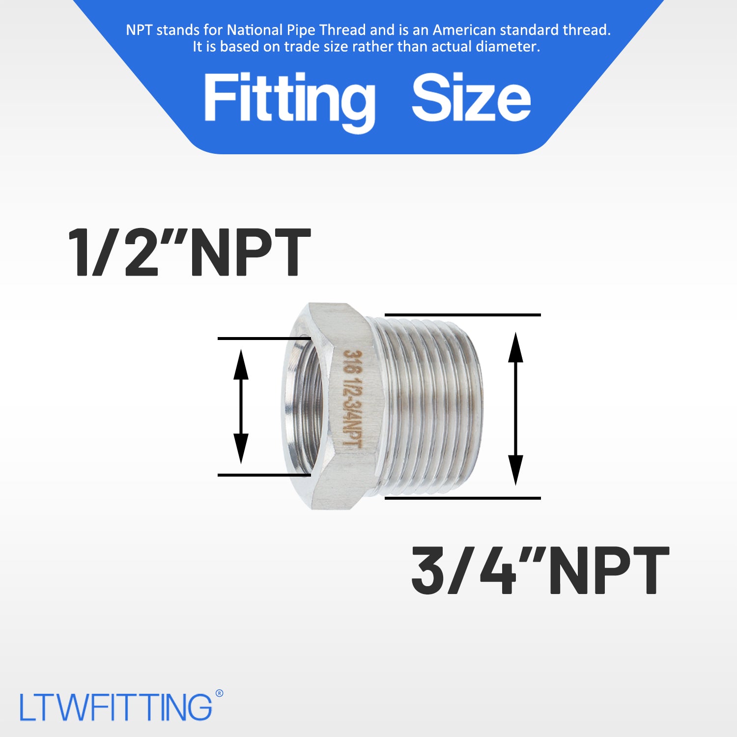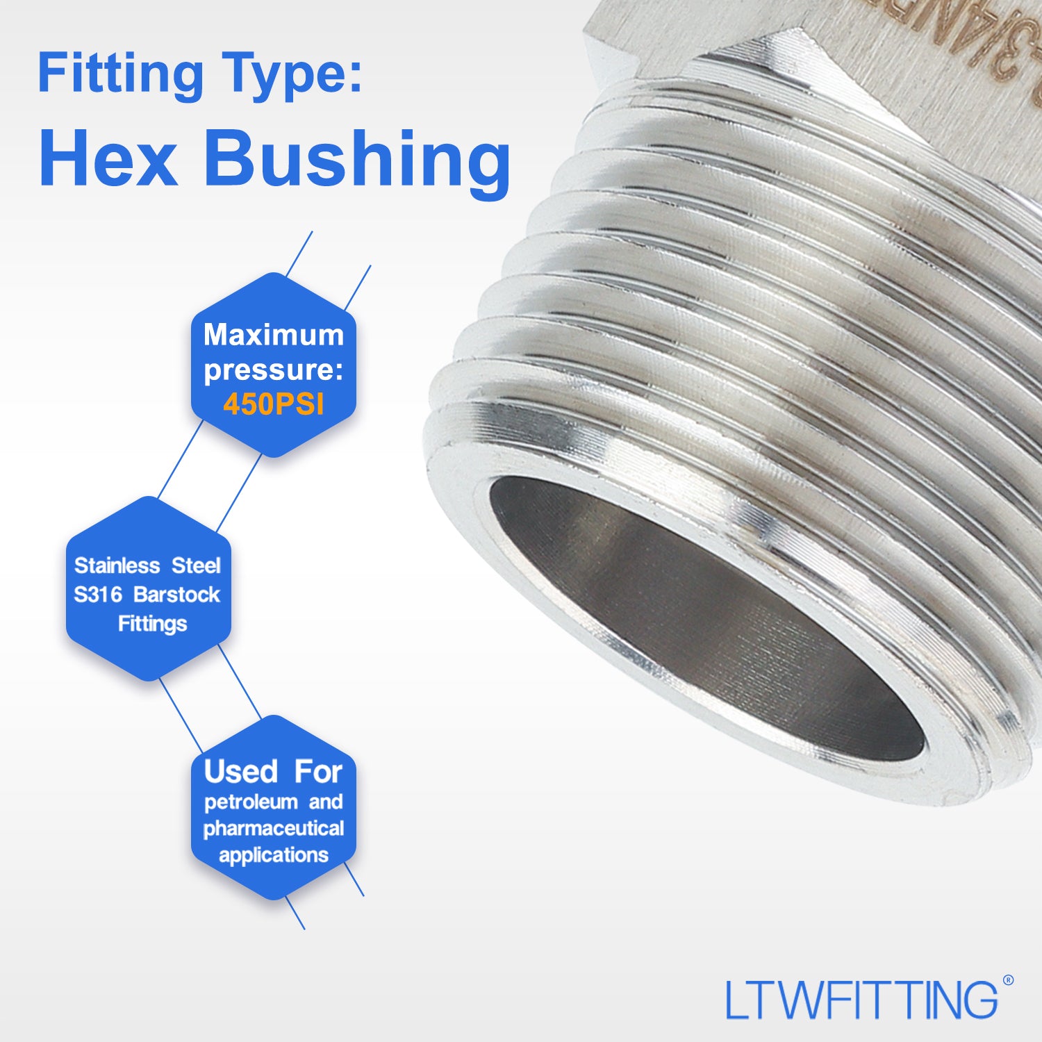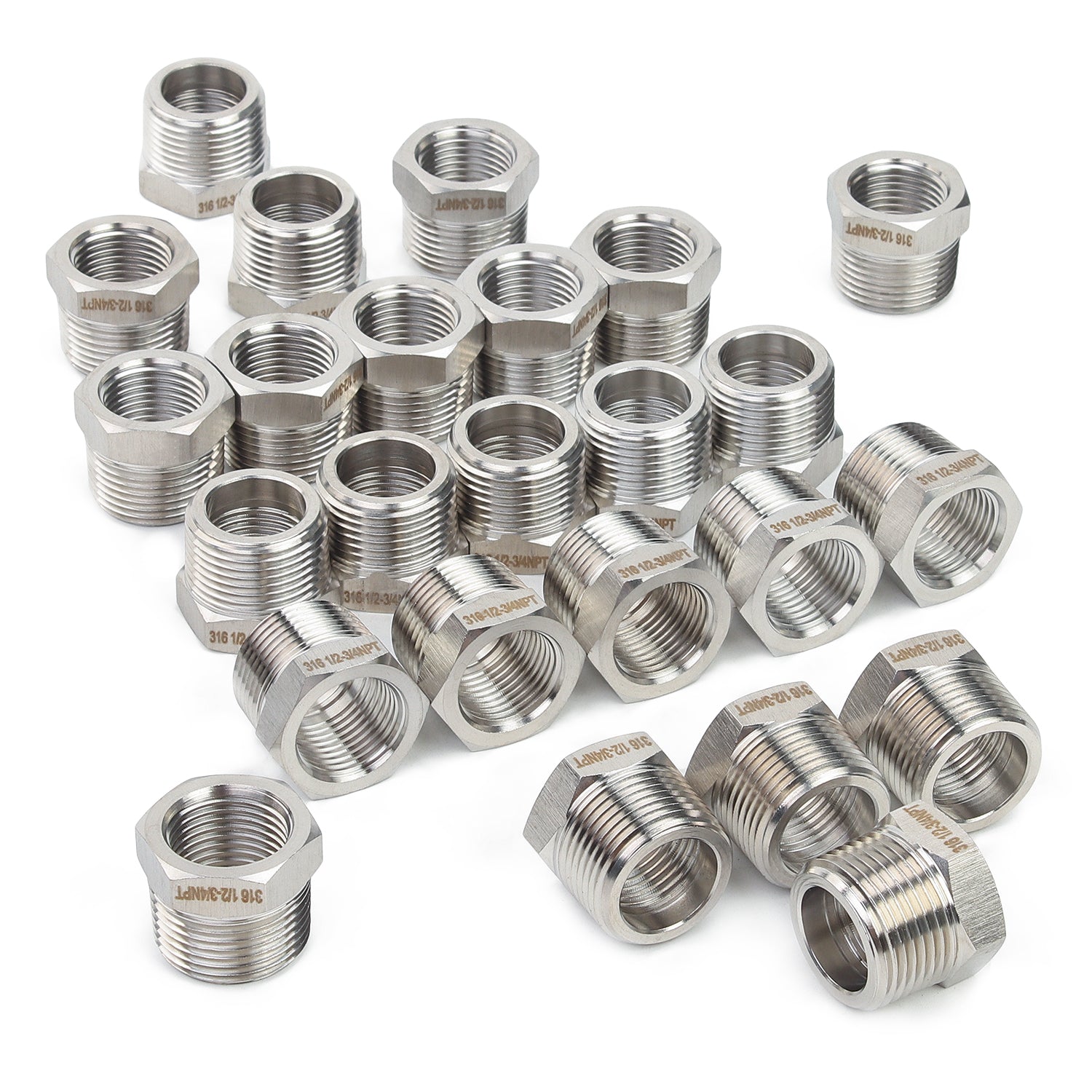 package include:25PCS Type: Hex Bushing Thread 1: 3/4Inch NPT Male. Thread 2: 1/2Inch NPT Female. Materies: Stainless Steel 316 Net Weight: 46.97g/pc